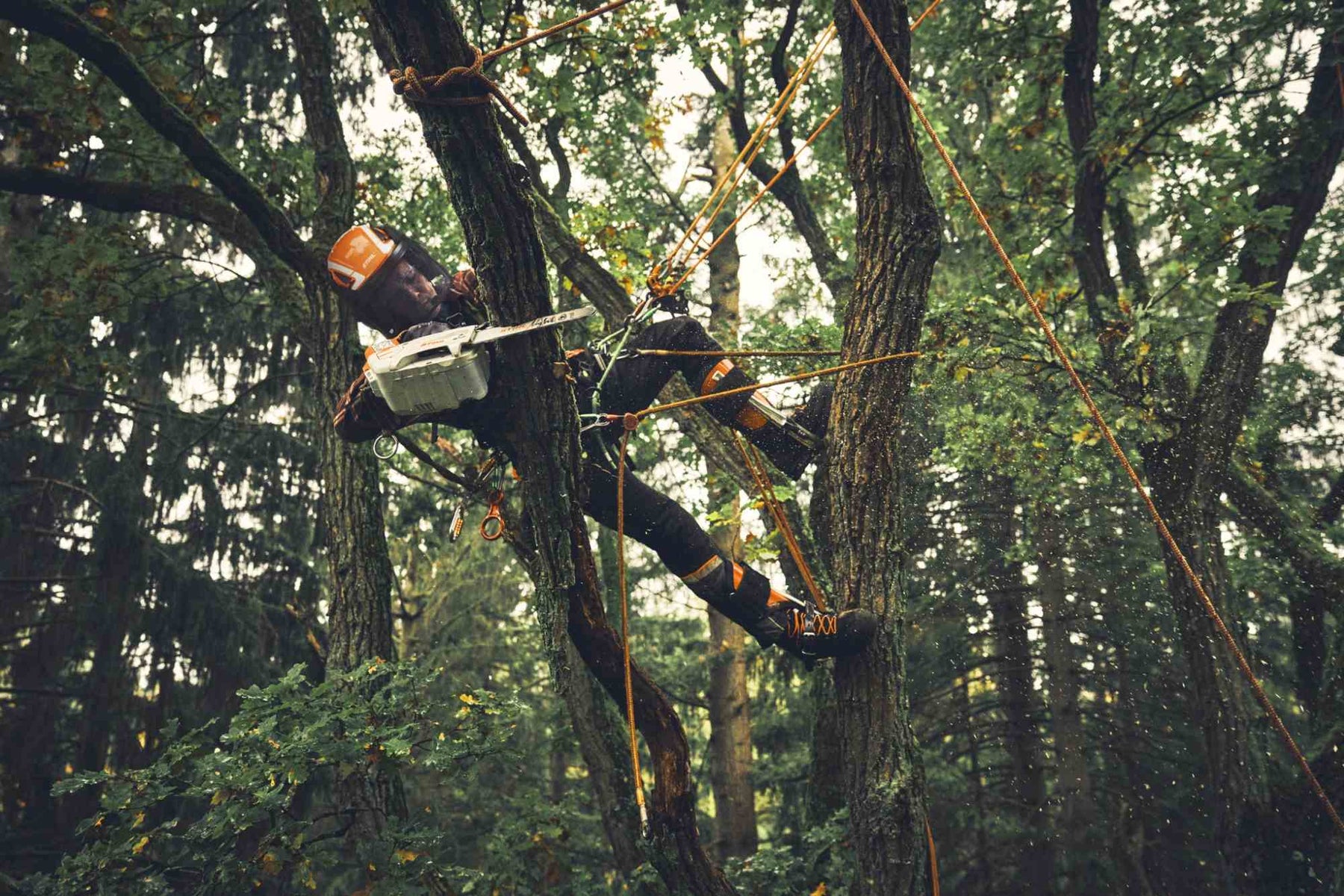 Warnung: Diese Spezialmotorsäge ist nur für in der Baumpflege ausgebildete Fachkräfte bestimmt. Der Einsatz ohne ordentliche Ausbildung kann zu schweren Verletzungen führen.