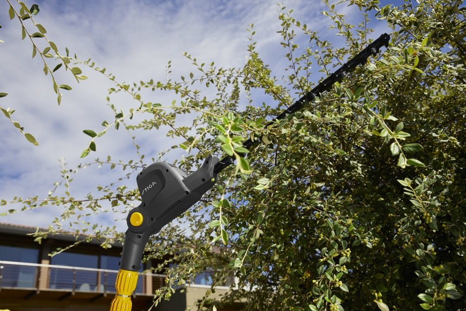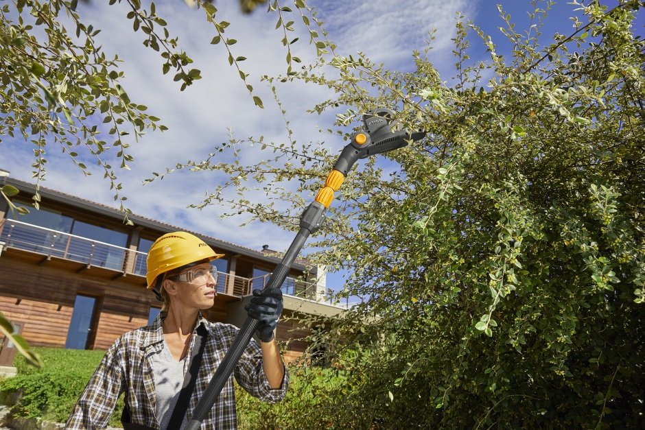Da der Griff mit dem Gerät gerade ausgerichtet ist, fühlt sich die PH 700e Akku-Teleskop-Heckenschere perfekt proportioniert und ausgewogen an. Der empfohlene 48-V-Akku (2 Ah) ist optimal positioniert und befindet sich gleich neben dem 450-W-Bürstenmotor. Bei einem Gewicht von nur 6,1 kg ist dieser ergonomisch designte Akku-Teleskop-Heckenschere leicht zu bedienen. Einfach in den mitgelieferten Tragegurt einhaken und mit den Trimmarbeiten beginnen. Alle Steuerungen sind unmittelbar am Griff mit Soft-Grip-Oberfläche angebracht. Die gummierte Oberfläche des Schafts gewährleistet einen sicheren und komfortablen Einsatz. Den sofort aktivierbaren Trimmerkopf drehen, um die 48 cm langen lasergeschnittenen Dual-Action-Klingen in Position zu bringen. Wähle unter den sechs zur Verfügung stehenden Winkeln von 90° nach unten bis 45° horizontal nach oben aus. Dank der mit 26 mm weit auseinanderstehenden Zähne werden überwucherte Hecken und schwer erreichbare hartnäckige Äste leicht bewältigt.