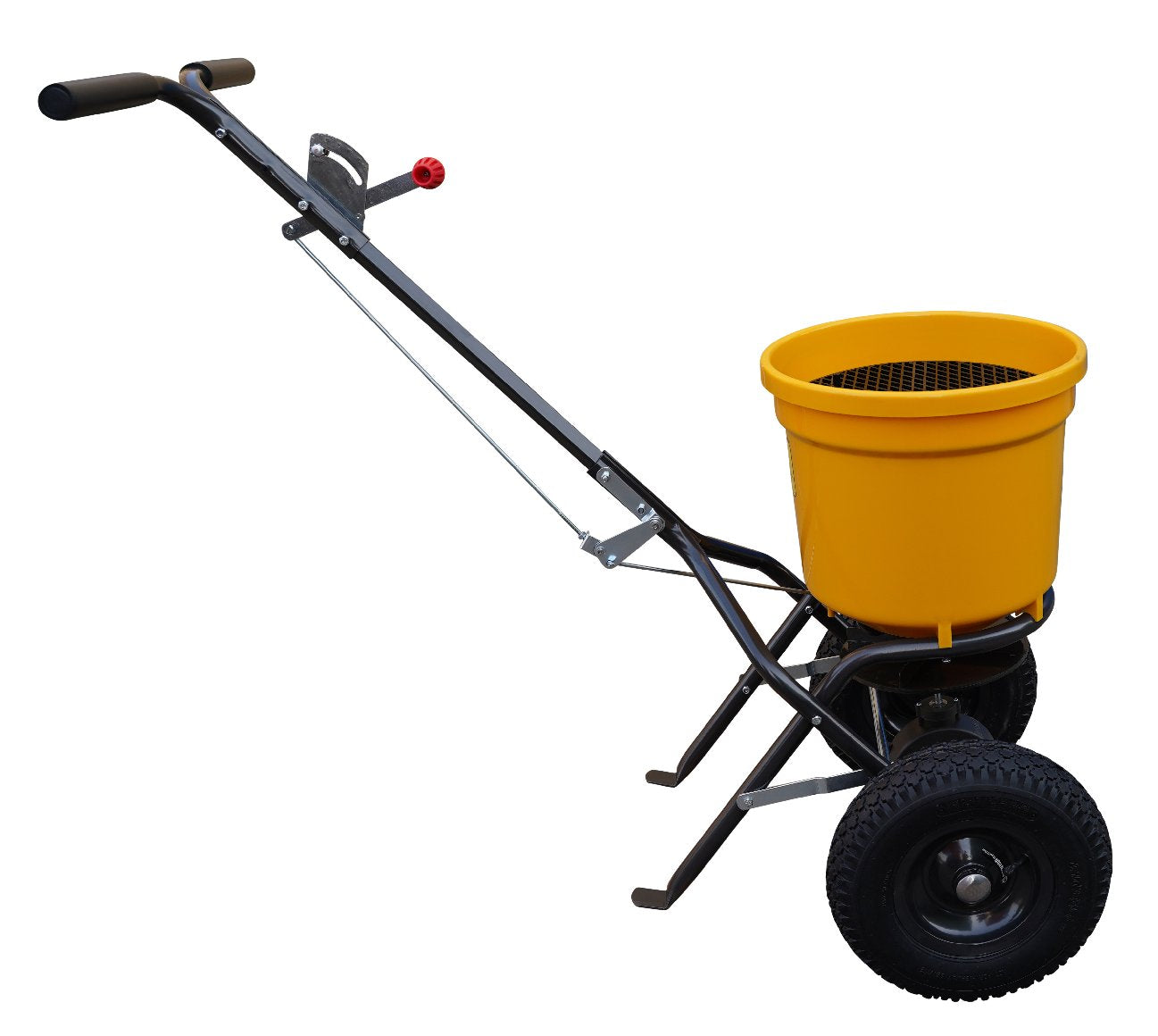 Der Streuer hat einen Polyestertank mit einem Fassungsvermögen von 25 Litern. Der Zentrifugalstreuer ist mit weichen Griffen und robusten 12-Zoll-luftbereiften Gummirädern ausgestattet, die ein einfaches Manövrieren des Streuers ermöglichen. Der Streuer ist einfach zu transportieren und kann von jedem genutzt werden. Im Winter ist dieser Zentrifugalstreuer eine nützliche Ergänzung zur Kehrmaschine. Der Streuer wird ohne Montage geliefert und enthält eine Bedienungsanleitung.