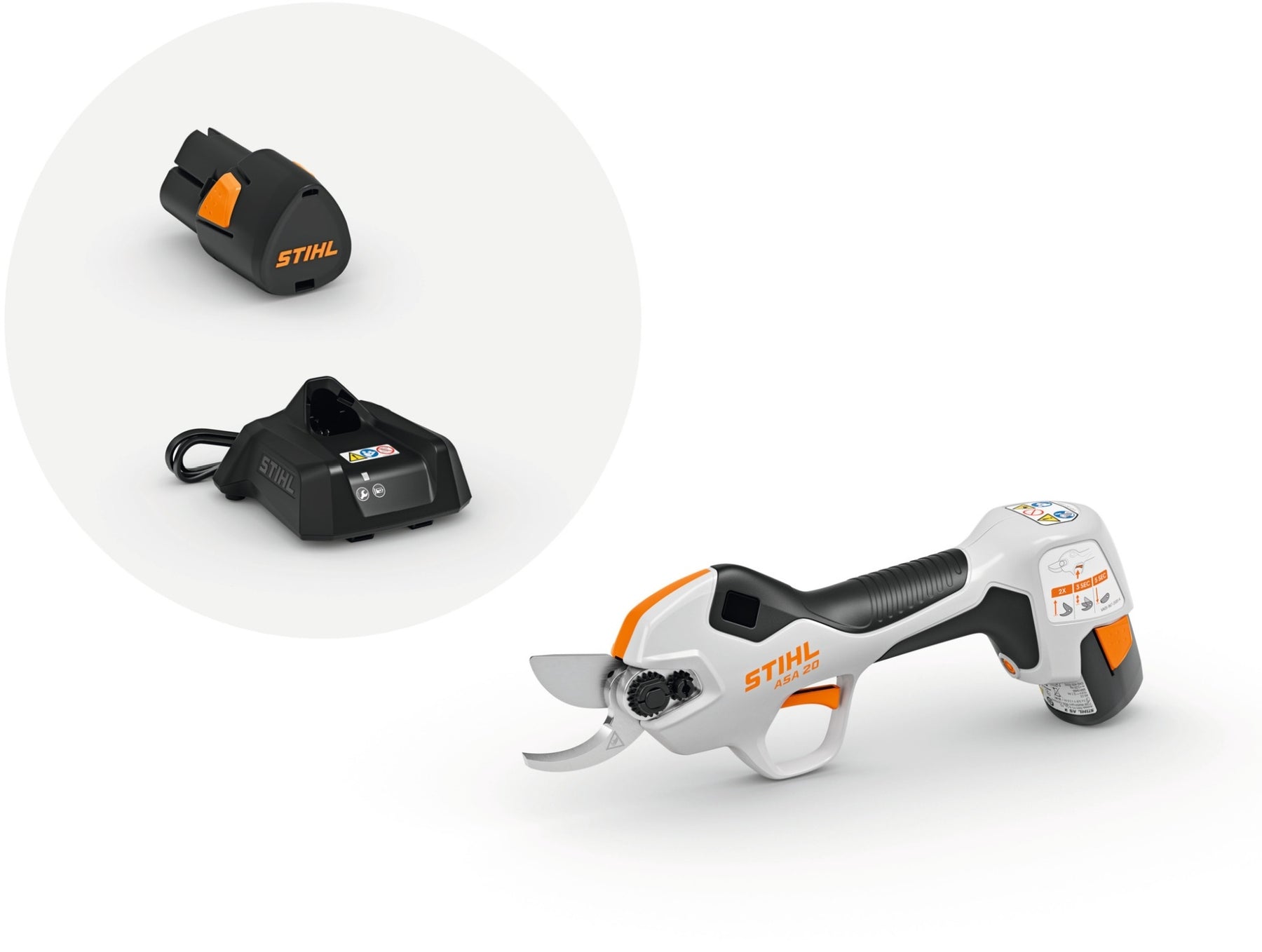 Falls Sie noch keinen Akku und kein Ladegerät aus dem STIHL AS-System besitzen, ist der Kauf dieses Sets besonders praktisch. Denn zusätzlich zur Akku-Astschere ASA 20 erhalten Sie einen Akku STIHL AS 2 und ein Standardladegerät STIHL AL 1. So können Sie direkt nach der Lieferung mit Ihren Schneidarbeiten beginnen.