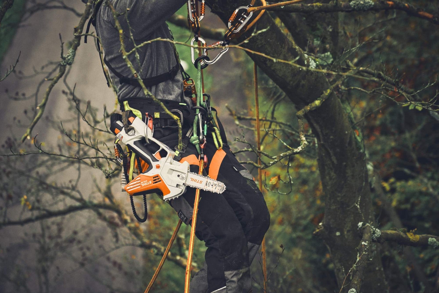 Basis für ein sauberes Schnittbild und einen schnellen Arbeitsfortschritt sind der besonders leistungsstarke EC-Motor und die STIHL 1/4"-PM3-Sägekette. Die drehzahlabhängige, automatische Kettenschmierung ist ein weiterer Vorteil des STIHL GTA 40. Für eine präzise Handhabung verfügt der Akku-Gehölzschneider über einen ergonomisch geformten Bediengriff mit Handschutz und eine obere Griffstelle für die zweite Hand. Sie ist so geformt, dass ein Abrutschen bestmöglich verhindert wird. Die davor angebrachte, krallenförmige Abweisgeometrie grenzt den oberen Griffbereich zudem optisch und haptisch von der Schneidgarnitur ab. Das mechanische Bediensystem mit beidseitiger Wippe, die variabel dosierbare Kettengeschwindigkeit, der Kettenraddeckel mit seitlicher Kettenspannung sowie die LED-Ladezustandsanzeige sind weitere Vorteile des GTA 40. Nicht zu vergessen: die beidseitig angebrachten Einhängeösen aus Stahl zum Anbringen einer Absturzsicherung – zum Beispiel in der kletternden Baumpflege.