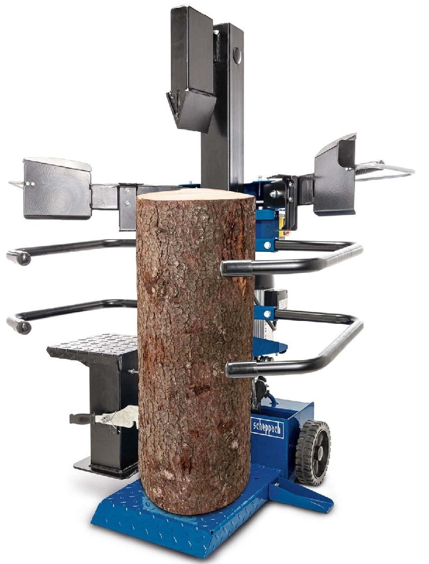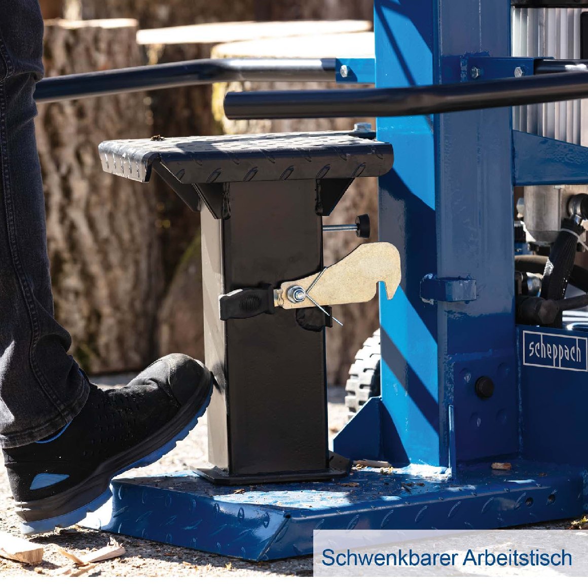 Dank einer patentierten Spalttechnik kann mit dem scheppach Compact 8t als einziger Holzspalter Europas unter 8 Tonnen Meterholz mit bis zu 1070 mm Länge und einem Durchmesser von 80 bis 350 mm gespalten werden. Mit dem integrierten, schwenkbaren Tisch stehen zwei Arbeitshöhen zur Verfügung: Stämme mit Maximallänge werden auf die Bodenplatte gestellt und können so auf Bodenniveau verarbeitet werden. Kleinere Stämme werden zur Verarbeitung einfach auf den erhöhten Tisch gestellt.