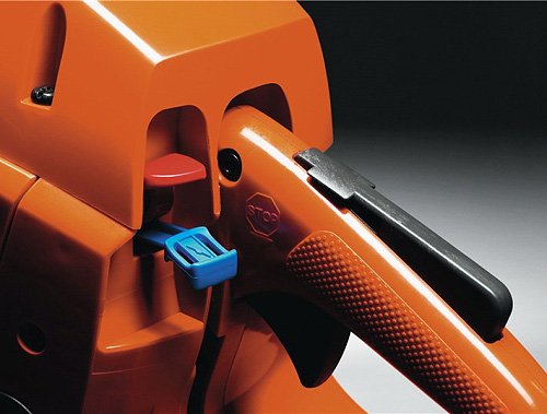 | Die Kettenbremse bringt die Kette zum Stillstand, sobald ein ausreichend starker Rückschlag die Kettenbremse zum Auslösen bringt. Der Anwender wird so vor Unfällen durch den sogenannten Rückschlag geschützt. | |