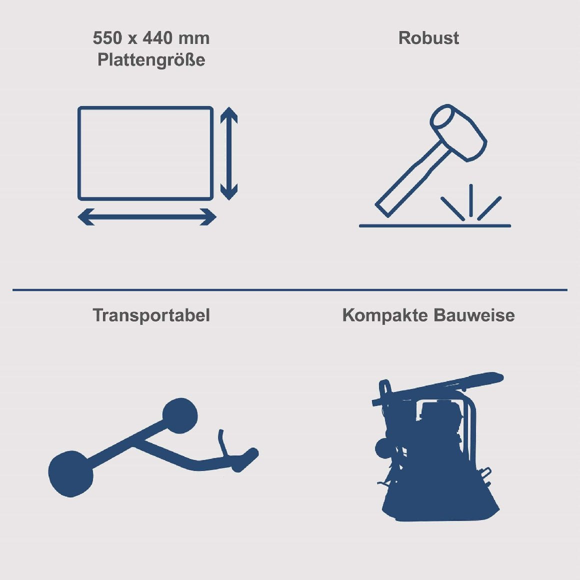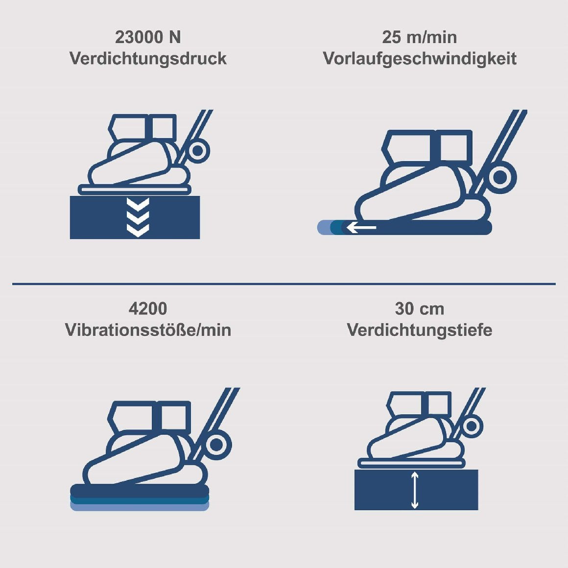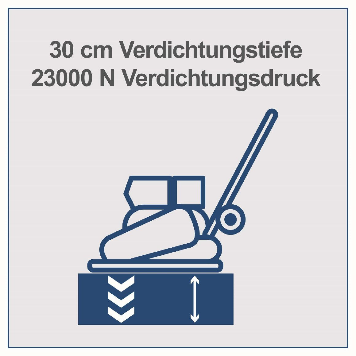 Der leistungsstarke 4-Takt-Benzinmotor mit 6,5 PS sorgt für eine gute Arbeitsgeschwindigkeit. Dank der automatischen Vorlaufgeschwindigkeit von 25m/min lässt sich auch in kurzer Zeit viel Fläche bearbeiten. Die Rüttelplatte arbeitet mit einem Verdichtungsdruck von 23000 N bei einer Verdichtungstiefe von 30 cm.