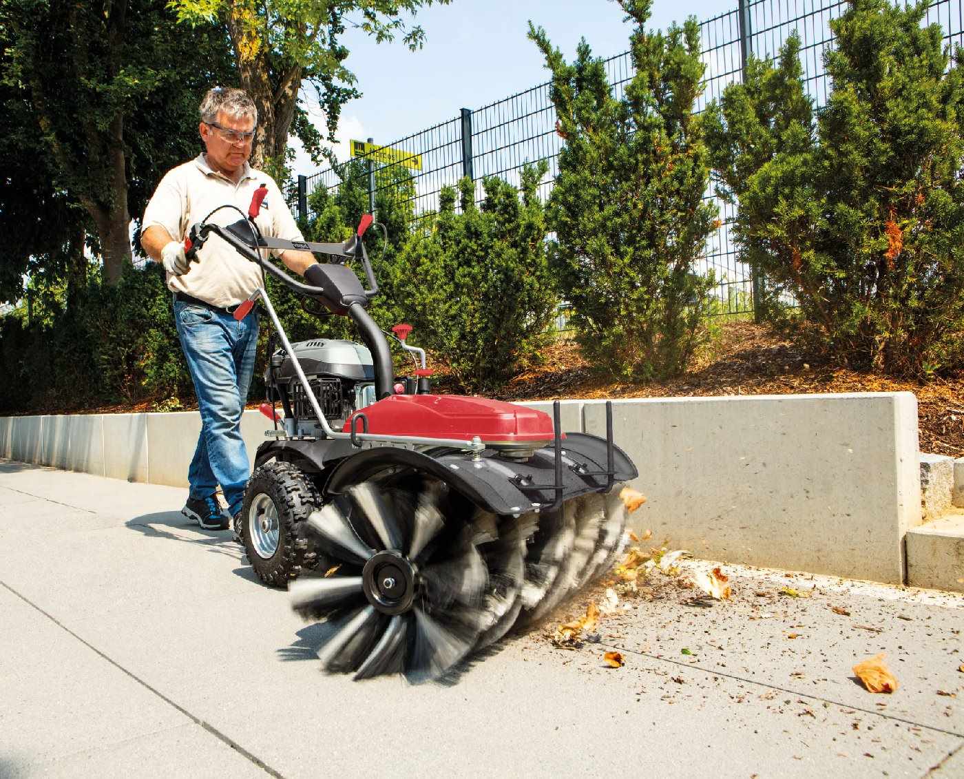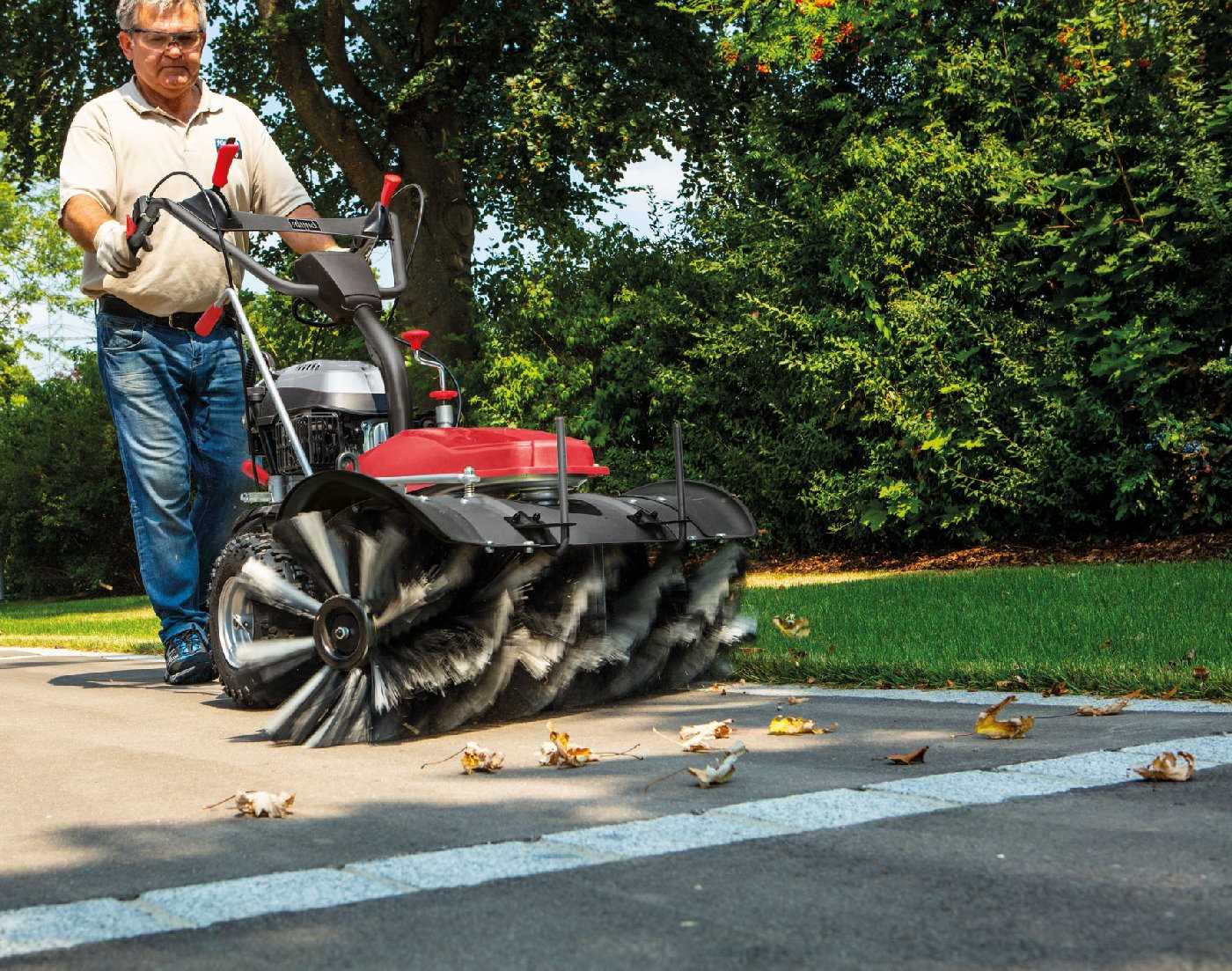 Für ein optimales Ergebnis ist die Kehrbürste in Winkel und Höhe verstellbar, auch die Drehzahl lässt sich anpassen. Laub, Schmutz und Streugut können direkt in dem vor der Kehrbürste montierbaren Auffangbehälter eingesammelt werden. Im Winter ist der Schnee mit dem 105 cm langen Schneeschild schnell geräumt. Optional können die Schneereste dann mit der Kehrbürste im gleichen Arbeitsschritt beiseite gekehrt werden - kein festgetretener Schnee, keine Glatteisgefahr. Dazu lässt sich die Kehrbürste separat zu- oder abschalten.