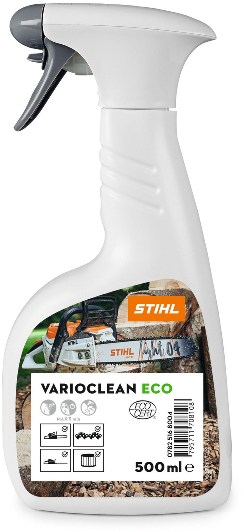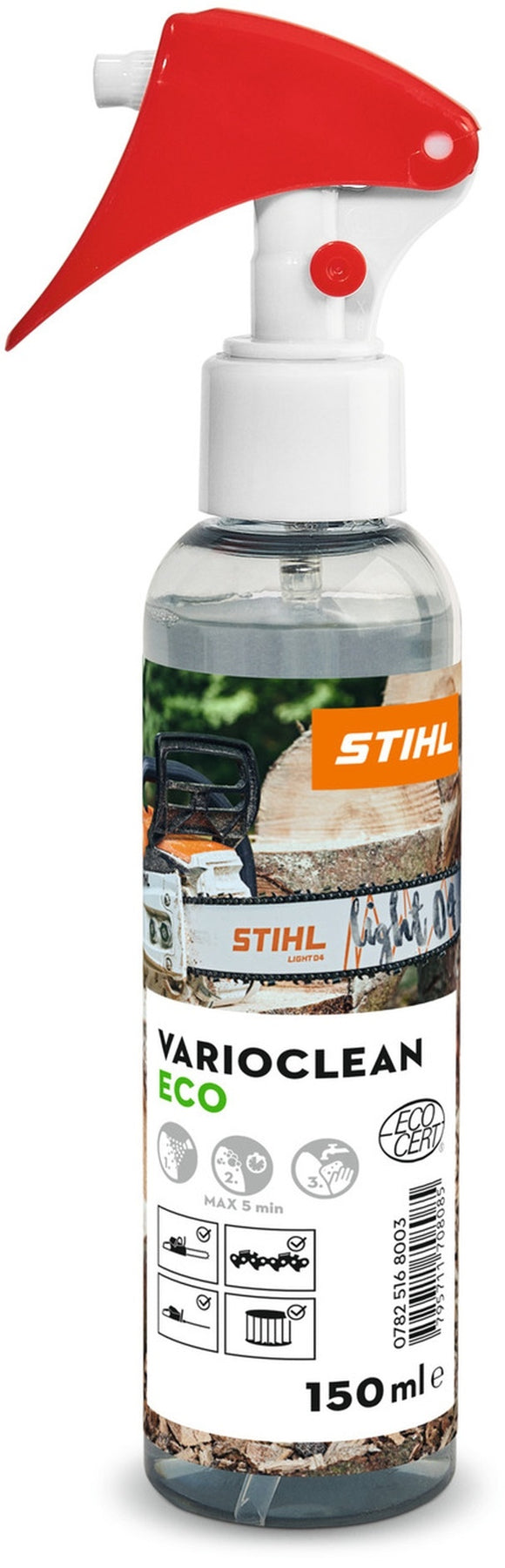 Der Spezialreiniger STIHL VarioClean Eco löst und entfernt zuverlässig Verschmutzungen, z.B. durch Öle, Fette, Harz, Pflanzenreste und Grasflecken, von Oberflächen Ihrer STIHL Geräte oder Ihres Zubehörs. Damit können Sie neben Gerätegehäusen auch Führungsschienen, Sägeketten, Messer, Kreissägeblätter oder den Luftfilter Ihrer Motorsäge oder Ihres Nass- und Trockensaugers effizient und umweltfreundlich reinigen. Das STIHL VarioClean Eco mit angennehmem Geruch ist sehr gut verträglich für verschiedene Materialien wie Kunststoff, Lack, Metalle, Aluminium und Gummi. Sie können es dadurch sehr vielseitig einsetzen. Die Flasche in handlicher Form besteht zu 50 % aus Rezyklat.