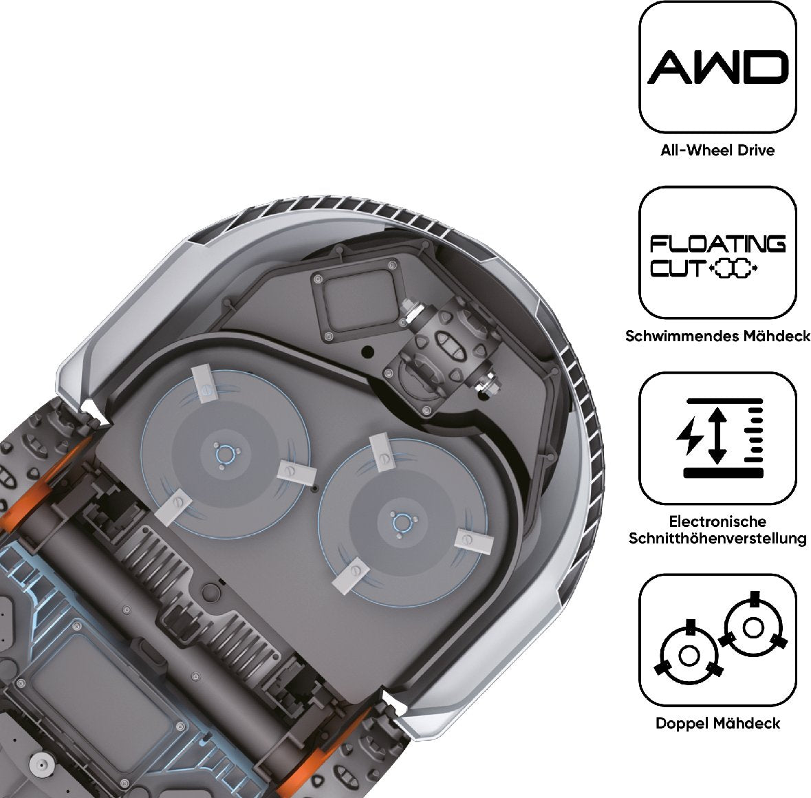 Mit einem Doppelteller-Design und einer Schnittbreite von bis zu 35 cm schneidet der X7 das Gras besonders schonend und effizient. Die synchronisierte Allradlenkung minimiert die Reibung auf dem Gras und sorgt dafür, dass die Grashalme aufrecht stehen, bevor sie geschnitten werden - für ein gleichmäßiges Ergebnis.