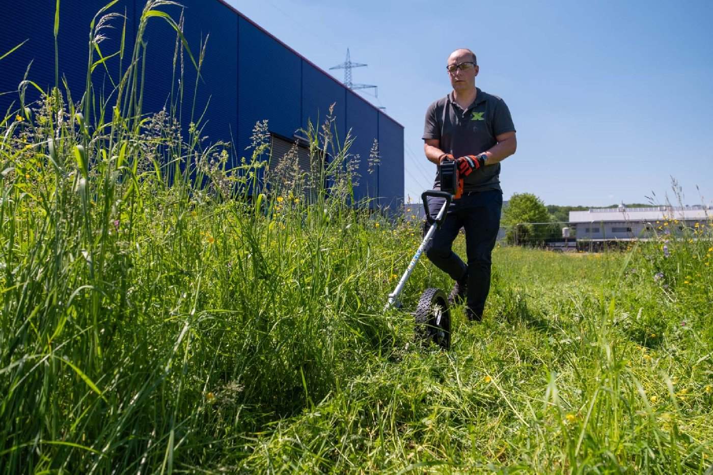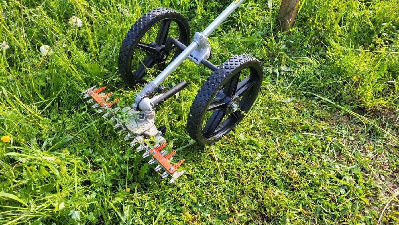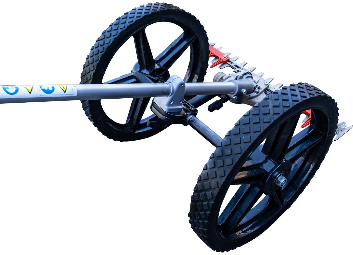 Schnitthöhe stufenlos von 0 bis 16 cm einstellbar • großen Stützräder für besten Komfort • hervorragende Führung auf unebenem Gelände