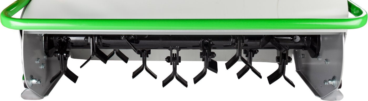 Schnitthöhe über Vorderräder einstellbar: 2-10 cm • 32 Y-Messer in Zweiergruppen aufgeteilt • Durchmesser Walze: 30 cm • mit seitlichen Gleitkufen