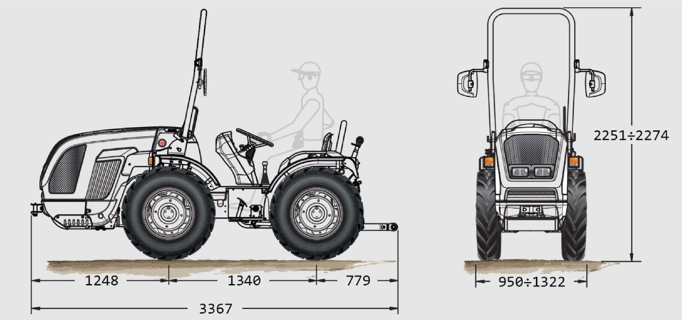 Der Cobram 60 AR Micro ist ein isodiametrischer Knicklenker-Traktor mit 49 PS, 12+12-Getriebe und reversiblen Fahrerstand. Dank seiner extrem kompakten Bauweise erreicht er eine Mindestbreite von nur 95 cm, ideal für engen Weinbau und Spezialkulturen.