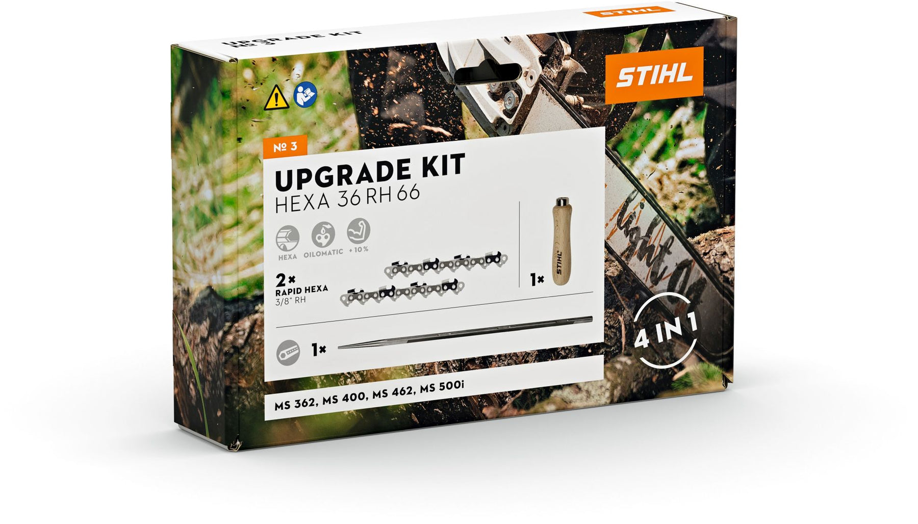 Mit dem STIHL Hexa Kit 3 können Sie Ihre STIHL Motorsäge mit wenigen Handgriffen auf das professionelle Hexa‑Schneidsystem umrüsten. Dieses patentierte Schneidsystem von STIHL setzt neue Maßstäbe in Sachen Schnittleistung, Schärfen und Lebensdauer. Damit können professionelle Waldarbeiter und Profis aus der Landwirtschaft mit ihrer STIHL Motorsäge noch schneller Bäume fällen und entasten.